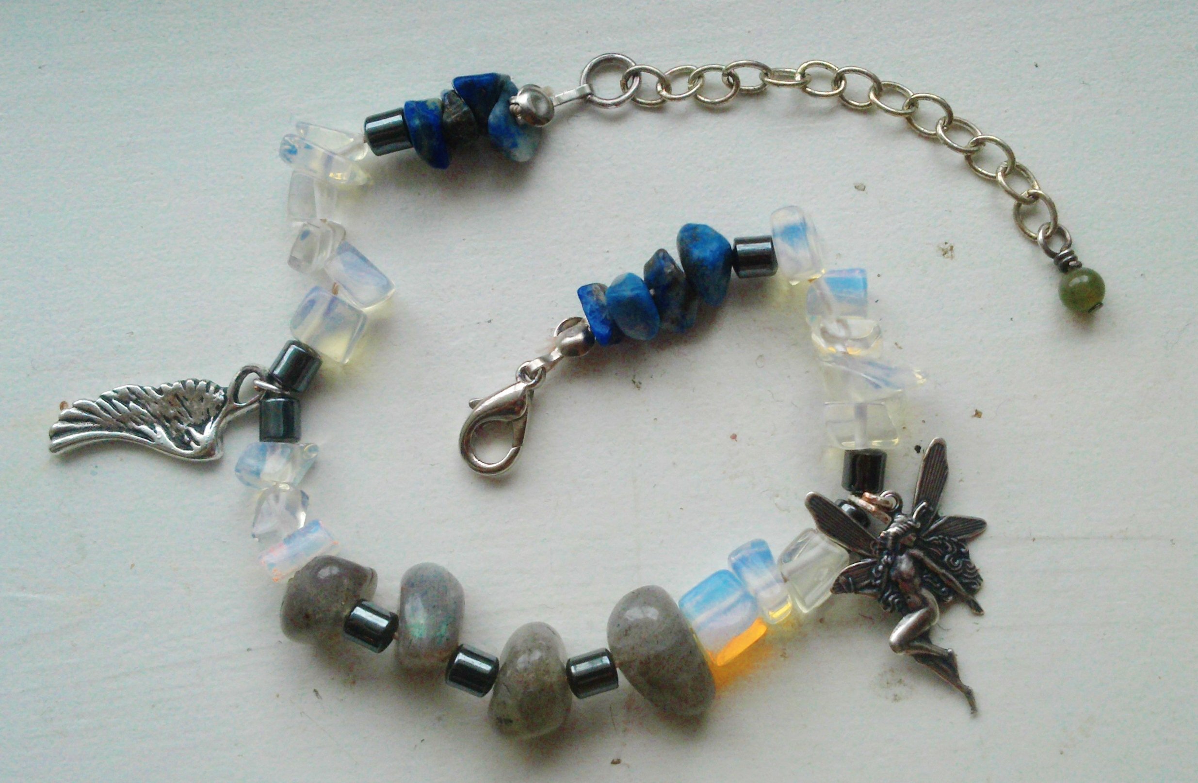 This one of a kind piece showcases fairy charms between chunks of moonstone and lapis lazuli. They are set around beautiful nuggets of labradorite and oval beads of hematite.