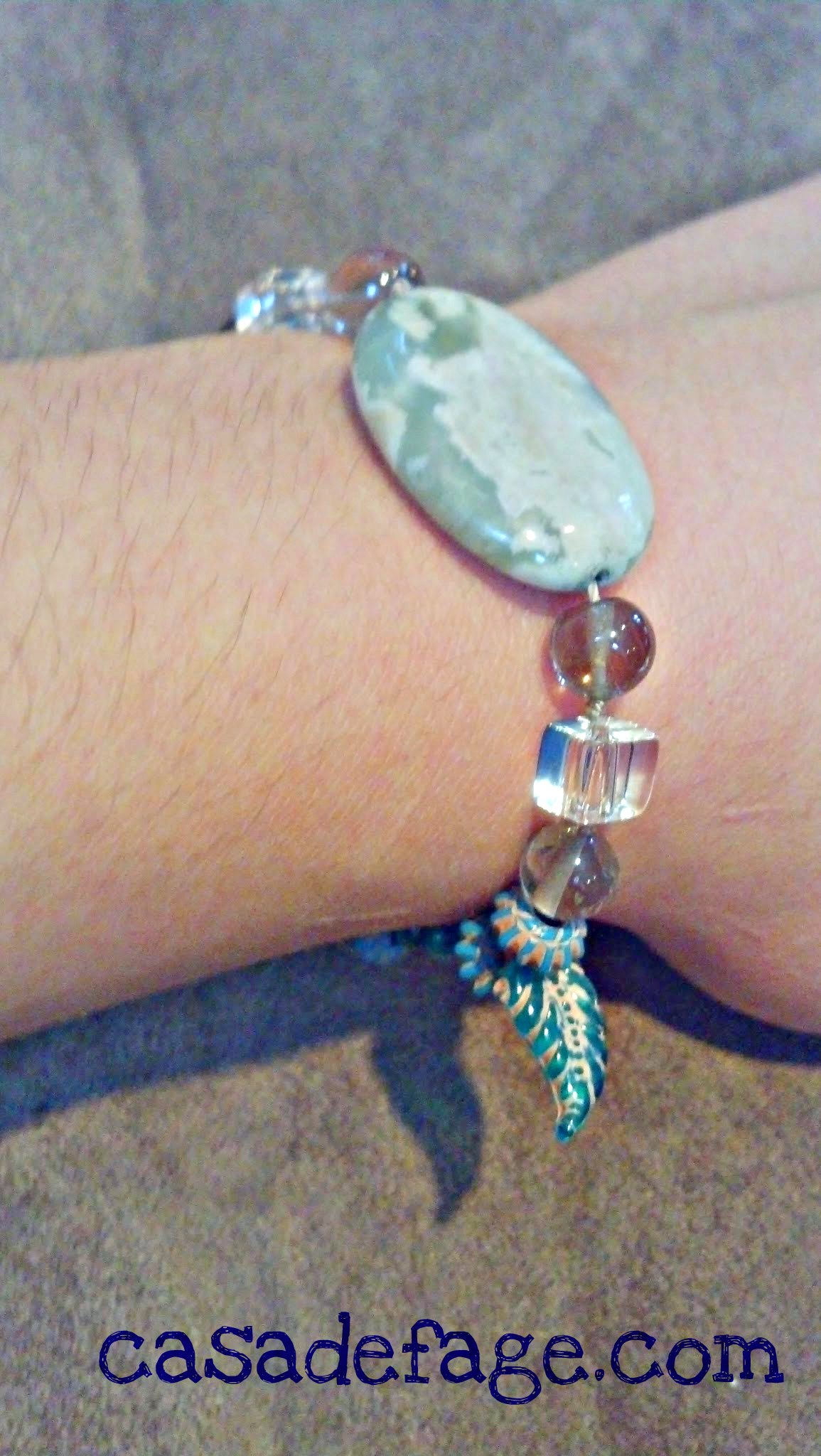 This bracelet features a large oval centerpiece of Harmony Jasper (aka Lotus Jasper). It also has smokey quartz and malachite, creating a peaceful, loving combination with a protective energy.