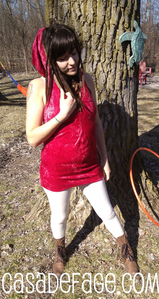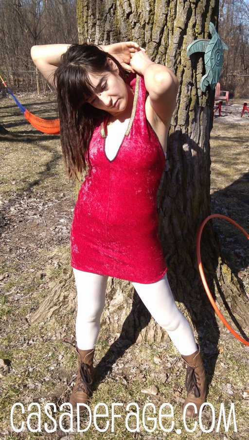 This super soft and extra comfy dress is made from crushed panne velvet. It is a halter cut with a hood. The material is stretchy and very forgiving, looks great on everyone!