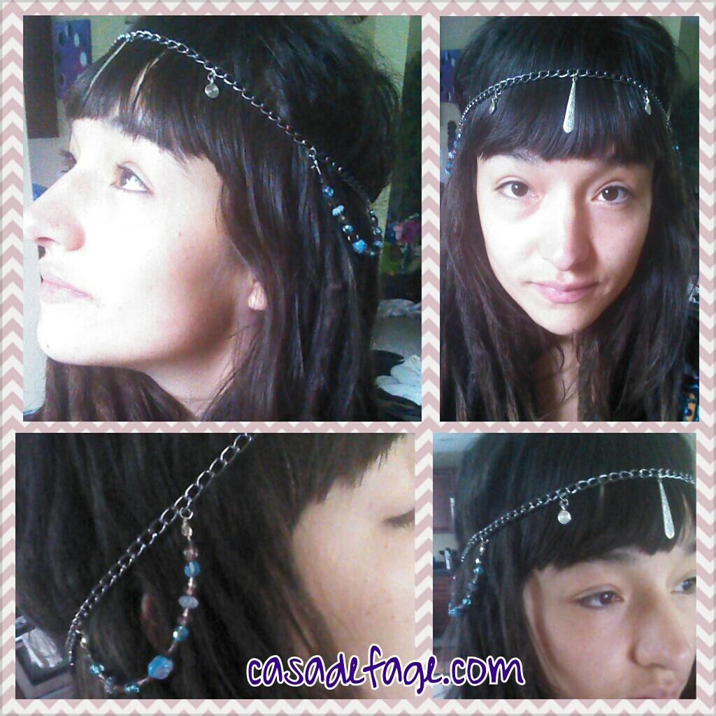 This tribal inspired head chain is made from dark gun metal chain and adorned with multiple charms. Two small spirals, a long tear drop with floral engravings in the center and two dangling strings of beautiful beads.